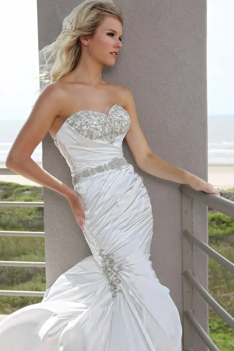 White, size 8. Dress measurements are approximate: Bust 35 inches, Waist 27 inches, Hips 39 inches. Please contact us for more information regarding this particular style and measurements to ensure a great fit.